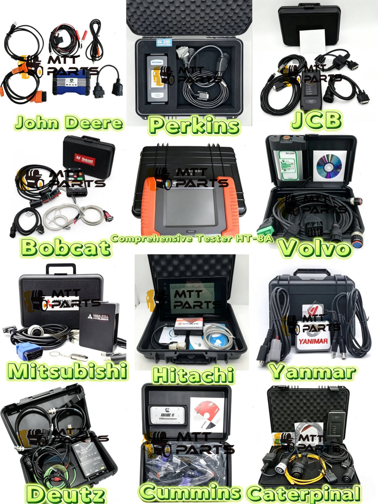 Она што се издвојува е колку тие изгледаат практично. Нема генерички алатки кои би можеле да полуработат; ова се поставки специфични за брендот што се поврзуваат правилно и ви ги даваат податоците што навистина ви се потребни. Има дури и сеопфатен тестер се-во-едно (HT-8A) прикажан во средината, плус опции за брендови за кои е малку потешко да се најде добра дијагностика, како што се Yanmar или Bobcat.