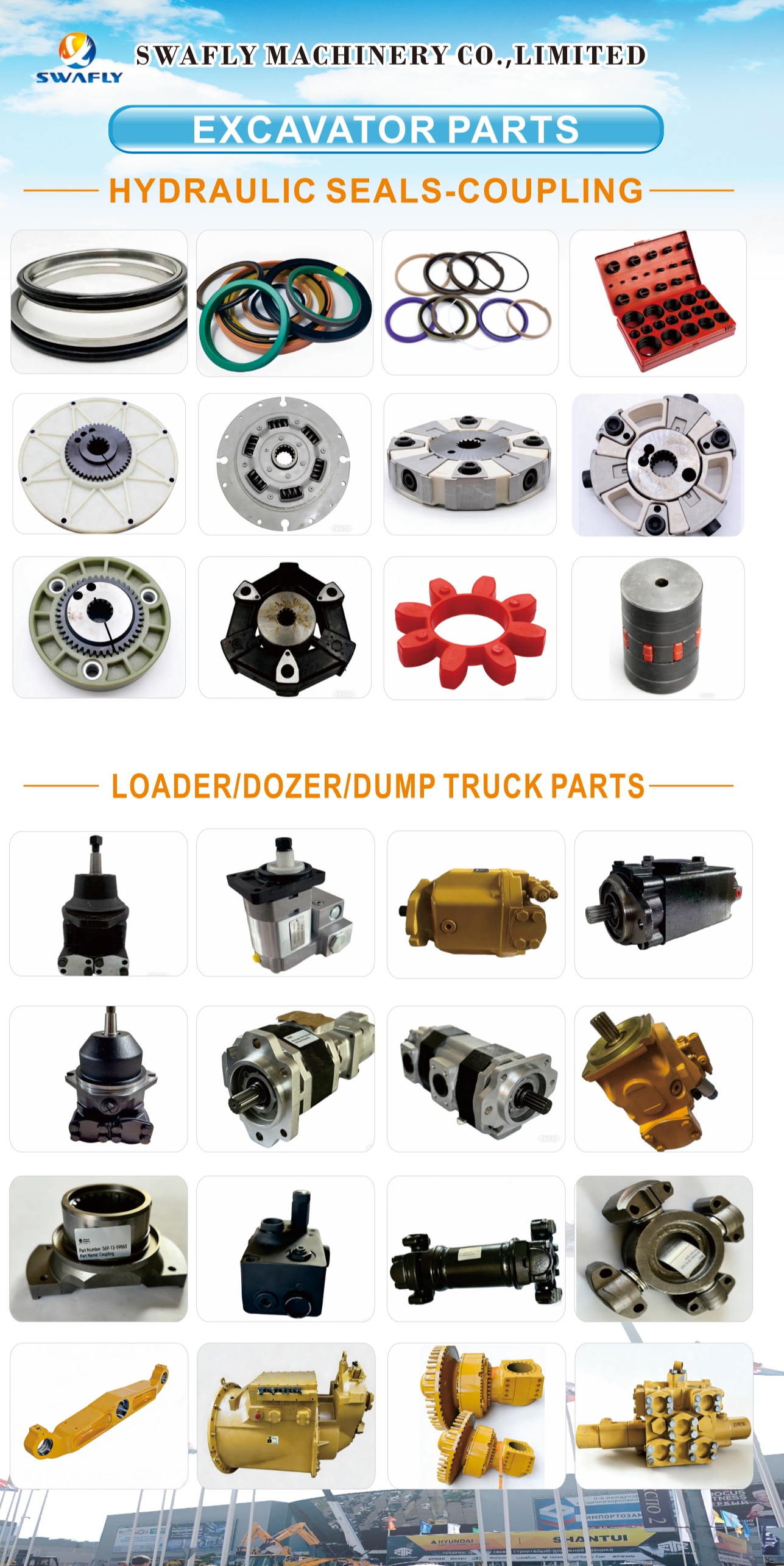 Носиме и доста делови за натоварувач, дозер и камион дампер. Работи како завршни погони, хидраулични пумпи, мотори за патување, мотори за нишање и други тешки компоненти на кои се потпираат овие машини. Повеќето од нив се квалитетни замени кои одговараат на популарните брендови без никакви проблеми.